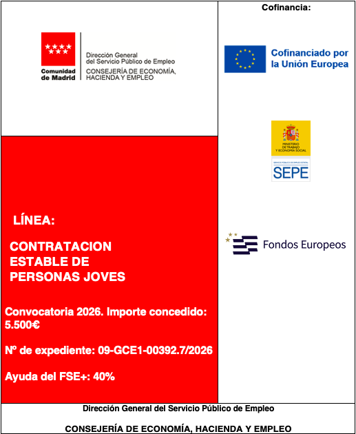 El Programa Talento Joven tiene por objeto apoyar a jóvenes beneficiarios de Garantía Juvenil en la búsqueda de empleo. El Programa Talento Joven se ejecuta con el apoyo del FSE+ al amparo del Programa de Empleo Juvenil 2021-2027. La empresa Solucion Relocation Services Madrid, S.L. ha resultado beneficiaria de una ayuda económica financiada por la Unión Europea por la contratación de un joven que ha participado en dicho programa.